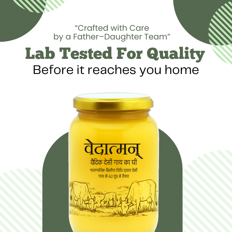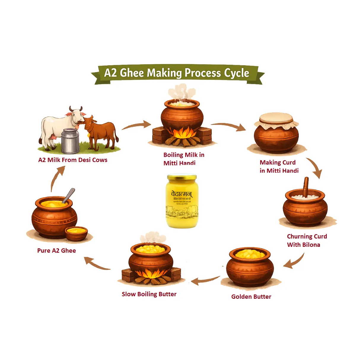 Vedatman A2 cow ghee is made using the traditional bilona method. First, curd is prepared from A2 cow milk, then hand-churned to extract butter, which is slowly heated to produce pure, aromatic ghee without additives or chemicals.
