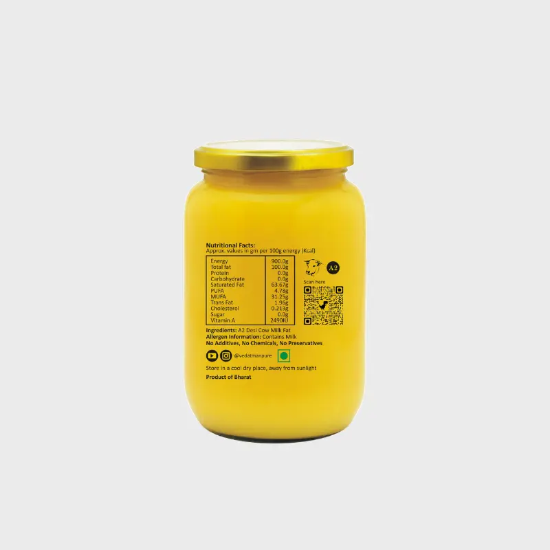 Yes, Vedatman A2 Desi Ghee is made from the milk of indigenous breeds of Sahiwal cows that produce only A2 beta-casein protein, which is believed to be easier to digest and have many health benefits. A2 milk contains vitamins A, D, E, and K, as well as essential fatty acids that are crucial for optimal health. Additionally, it is rich in butyric acid, which is known to have anti-inflammatory properties and may help support gut health.m the date of manufacture. It should be stored in cool, dark place away from direct sunlight.