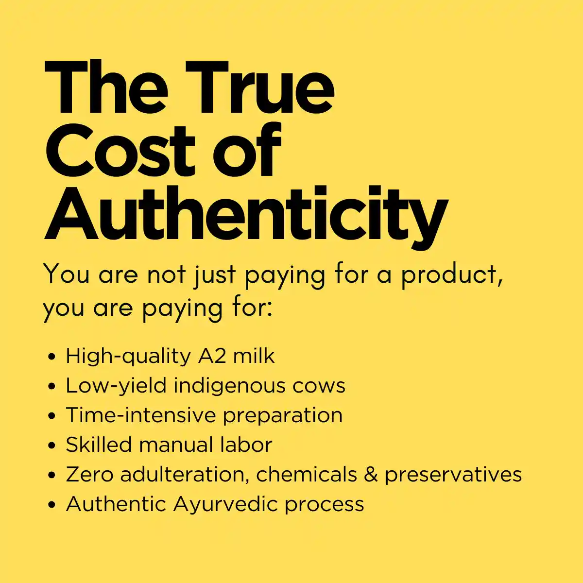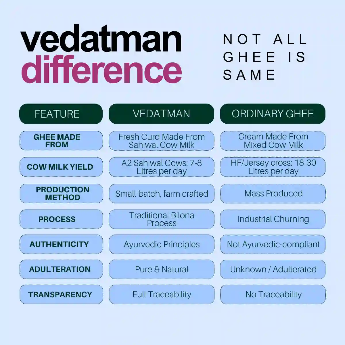 A2 cow ghee is traditionally prepared in small batches using the bilona method and high-quality indigenous cow milk, making it more time-intensive and premium. The yield from traditional methods is considerably lower compared to other conventional methods, which adds to the production cost. Lastly, Vedatman products are 100% pure natural and unadulterated. Adulteration brings down the cost considerably for you. But that comes at the cost of your health and that of your loved ones.